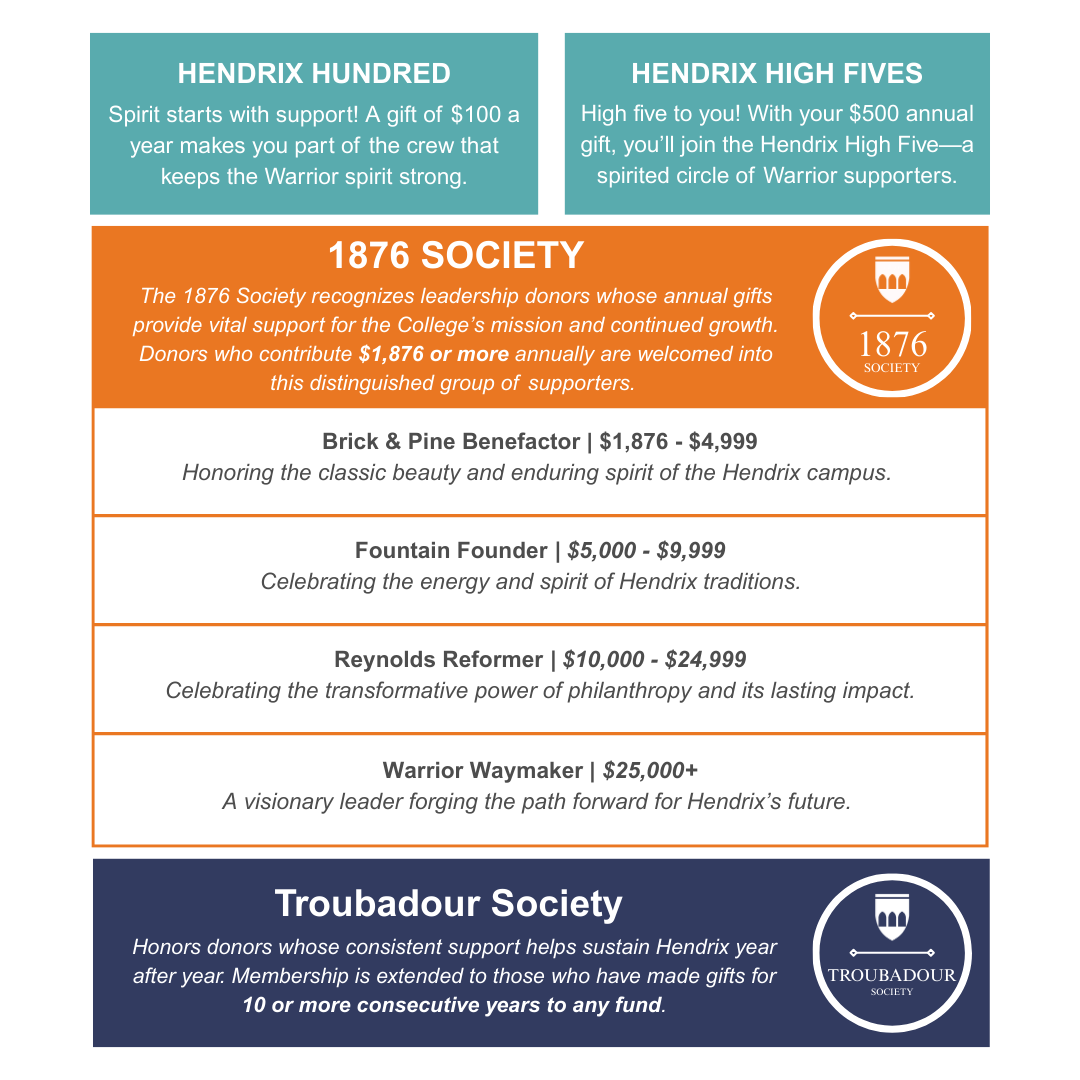 The Donor Honor Rolls reflect gifts to the Hendrix Fund and the Warriors Athletics Club made between June 1, 2025, and May 31, 2026. Make a Gift Now(Select a Class to See the Donor Honor Roll)![]() |